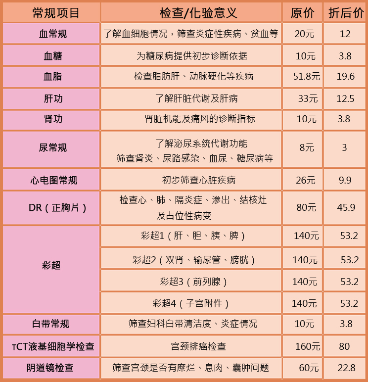 二重禮:常規(guī)檢查、化驗(yàn)費(fèi)3.8折(特殊檢查、化驗(yàn)除外),檢查省錢又省心!