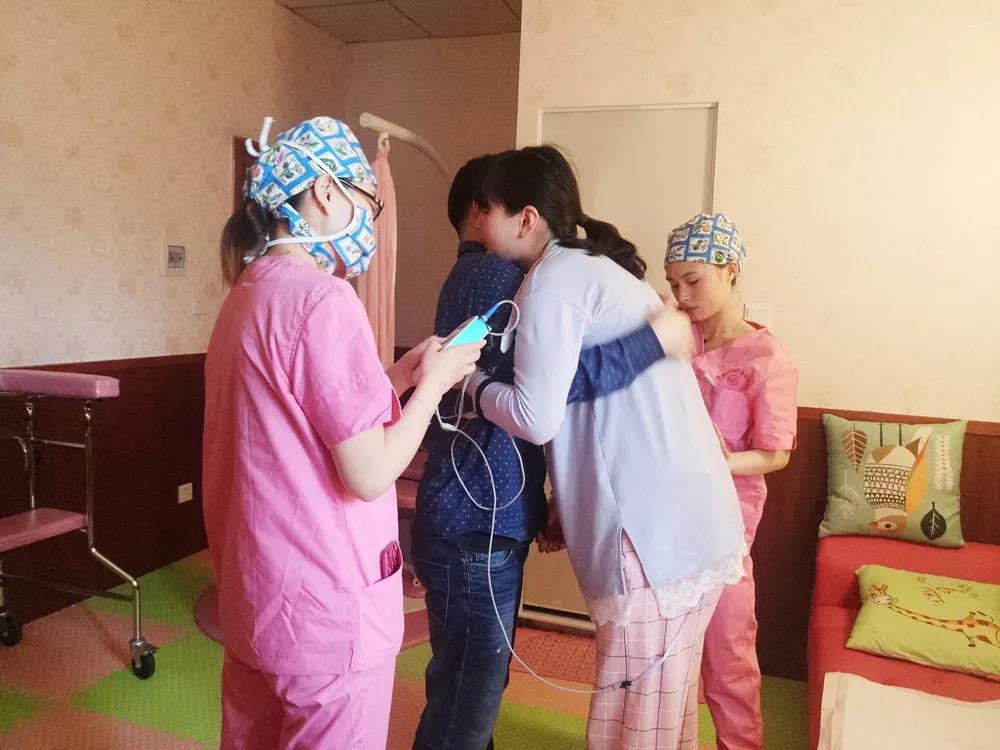 11:50,還不到1小時,巧巧的宮口已經開到5指。導樂師小楊開始帶領巧巧進行自由體位,并根據巧巧的身體情況為她調整快樂分娩鎮(zhèn)痛儀。