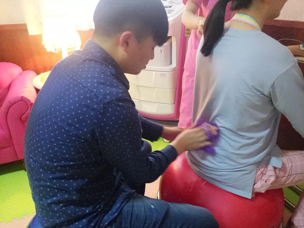 導樂師一邊教巧巧調整呼吸,一邊為巧巧用上快樂分娩鎮(zhèn)痛儀,并讓巧巧坐在導樂球上規(guī)律性的進行運動。不到兩分鐘,巧巧便感覺疼痛大大減輕。